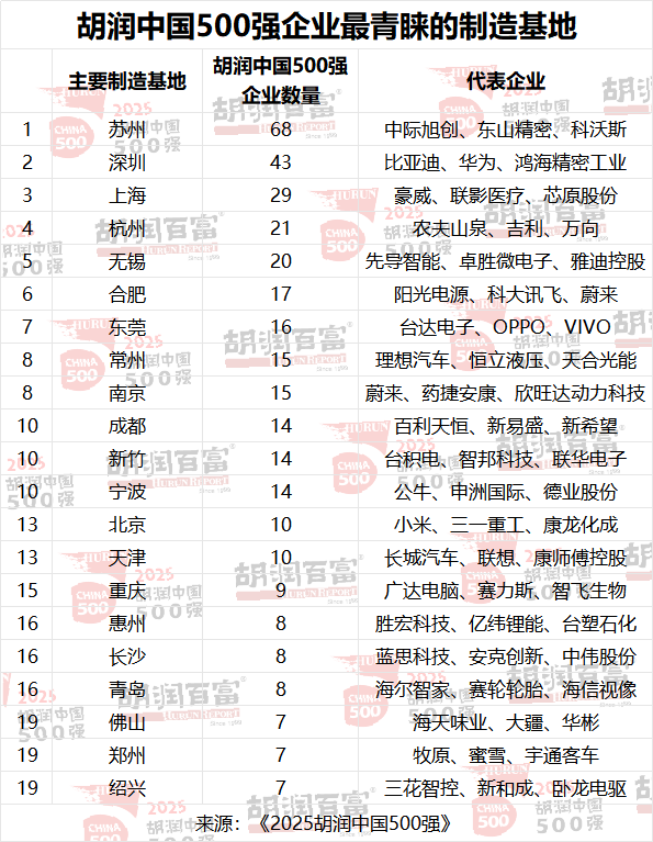 苏州成为胡润中国500强企业最青睐的制造基地,有68家企业将主要制造基地选定在苏州;其次是深圳,有43家;上海,有29家;杭州和无锡分别有21家和20家