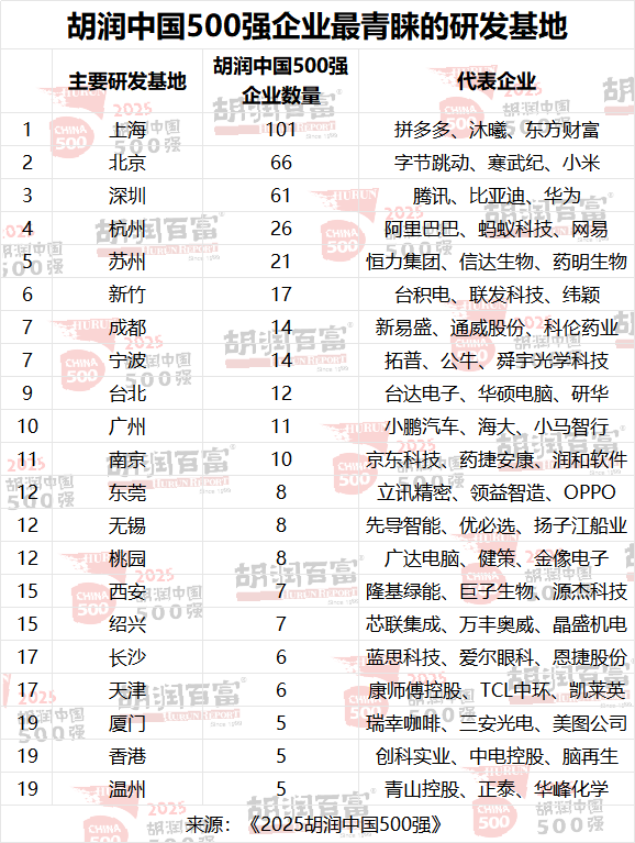 上海成为胡润中国500强企业最青睐的研发基地,有101家企业将主要研发基地设立在上海;其次是北京和深圳,分别有66家和61家;再次是杭州和苏州,分别有26家和21家