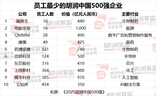 年营收最低的胡润中国500强企业是总部香港、专注于神经认知障碍和退行性疾病治疗的脑再生,其年营收为零,而价值却达到了440亿元。总部北京的半导体公司摩尔线程,年营收仅4亿元,而价值却达到了2830亿元。同样来自北京的半导体公司龙芯中科,年营收仅5亿元,价值却达到520亿元。来自上海的半导体公司沐曦,年营收仅7亿元,价值却高达3320亿元。还有来自香港、从事能源行业的电能实业,年营收仅8亿元,价值却达到了1000亿元。