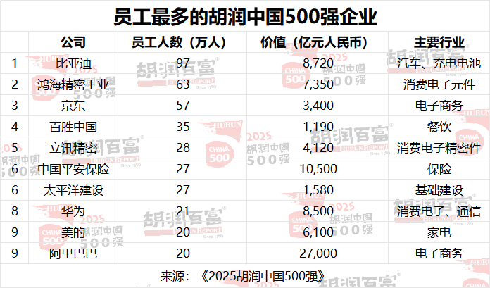 另一方面,有27家企业的员工人数超过10万人。在这些大型企业中,比亚迪、鸿海精密工业和京东的员工人数位居前三,分别拥有97万、63万和57万名员工。