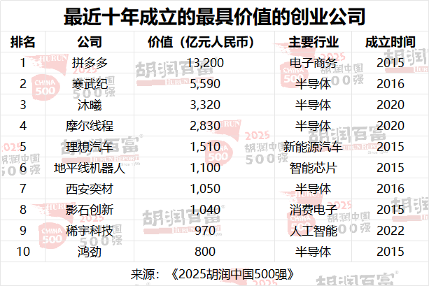 “近十年成立的‘胡润新势力企业’,价值TOP10中,算力相关企业占据六席,包括寒武纪、沐曦、摩尔线程等;拼多多远远第一。其他还包括新能源汽车制造商理想汽车、智能影像设备企业影石创新、3D打印机制造商拓竹科技,以及新消费赛道的瑞幸咖啡与元气森林等。”