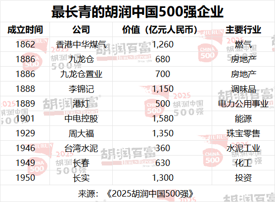 有40家企业的历史超过50年,其中六成来自香港和台湾。有6家企业的历史超过百年,全部来自香港,包括160多岁的香港中华煤气、130多岁的房地产企业九龙仓置业和九龙仓,以及李锦记等。