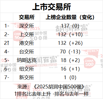90%为上市公司。深交所(137家)成为胡润中国500强企业首选的上市交易所,上交所和港交所并列第二,各132家