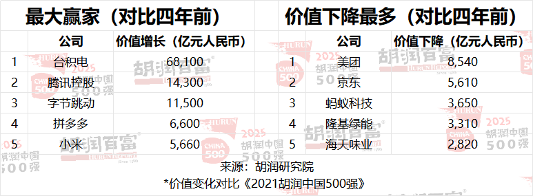 “变化真大,近40%的今年上榜企业四年前还未上榜。新面孔主要来自消费电子、AI算力、新能源等领域。落榜者主要来自疫苗等领域。企业层面,最大赢家是台积电、腾讯、字节跳动、拼多多和小米,价值下降最多的是美团和京东,其次是蚂蚁科技。”