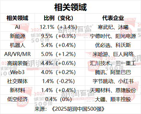 上榜公司中,涉及AI领域并以AI为主导方向的占比12.1%,新能源领域占9.5%,机器人领域占5.4%,AR/VR/MR领域占5%,高端装备领域占4.4%,低空经济领域目前占比不超过1%。