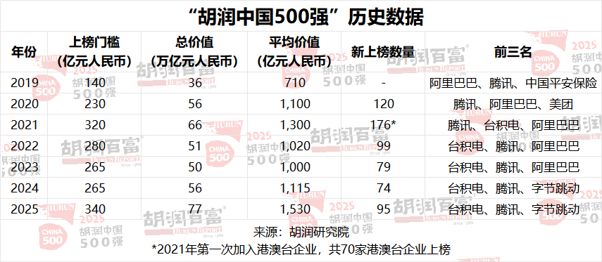 《2025胡润中国500强》的上榜门槛比上一年上升75亿元,达到340亿元(涨幅28%)。500强企业的总价值增长21万亿元(38%),达到77万亿元。平均价值增长415亿元,达到1530亿元。上榜企业中,有386家企业的价值比上一年有所增长,其中包括95家新上榜企业;16家企业的价值与上一年持平;102家企业的价值有所下降。65%为B2B企业,比上一年增加8%;35%直接面向消费者。75%的企业提供实体产品;25%提供软件或服务。半导体、传媒娱乐、工业产品以及消费品这四个行业占据了胡润中国500强总价值的一半。500强企业的平均年龄为29岁,即平均成立于1996年。
