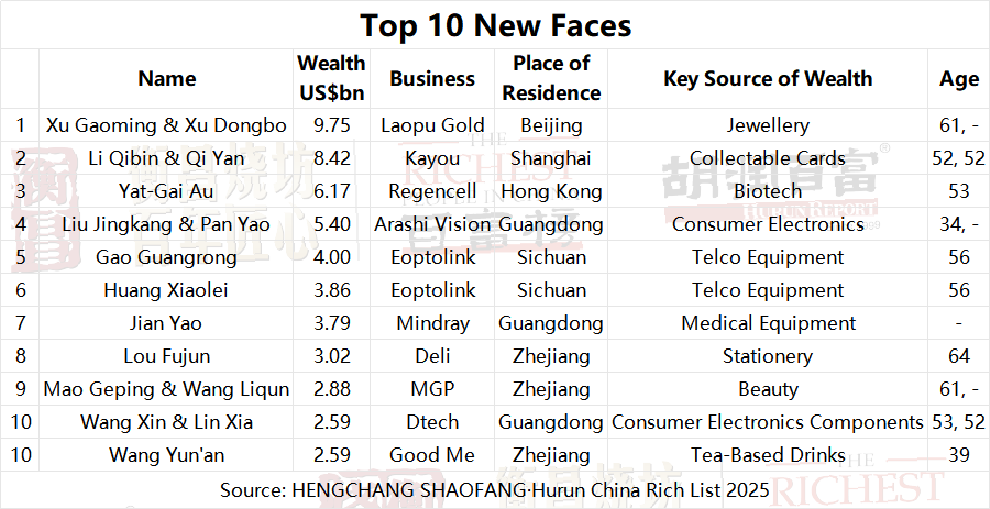 l 376 new faces, seven times the number of new faces last year, led by Xu Gaoming, 61, & Xu Dongbo of Beijing-based luxury brand Laopu Gold with US$9.7bn. The second highest new entry was Li Qibin, 52, & Qi Yan, 52, of Beijing-based collectable trading cards business Kayou, with US$8.4bn. Both Xu and Li broke straight into the Hurun Top 100. The youngest new faces included JK Liu Jingkang, 34, & Pan Yao, of social media cameras brand Insta360 with US$5.4bn. Bubble tea brands have had an amazing year, led by Wang Yun’an, 38, of Good Me with US$2.6bn, Zhang Junjie, 30, of Chagee with US$1.9bn, Shan Weijun, 47, & Zhou Rongrong, 46, of Auntea with US$1.3bn.