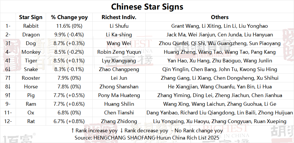 Those born in the Year of the Rabbit continue to be the best wealth creators, with the most individuals on the Hurun list for an unprecedented 14th year, despite 80% of the list changing in that period. Dragons and Dogs were second and third. Those born in the Year of the Rat had a good year, whilst those born in the Year of the Dragon dropped down the most.