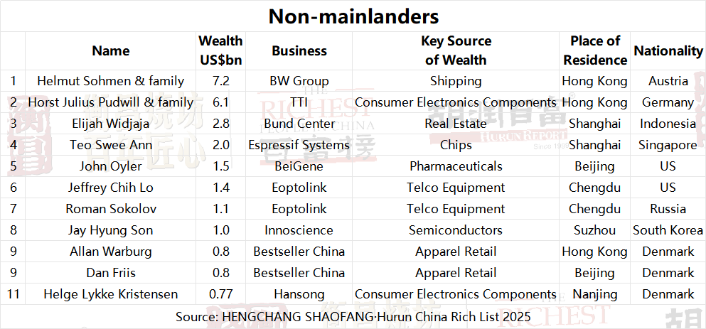11 individuals from the Hurun China Rich List were born outside of Greater China. Denmark and the US stood out. The richest self-made entrepreneur is Teo Swee Ann of Espressif Systems, a Singapore native who makes chips, and John Oyler of BeiGene, an American who makes anti-cancer drugs.