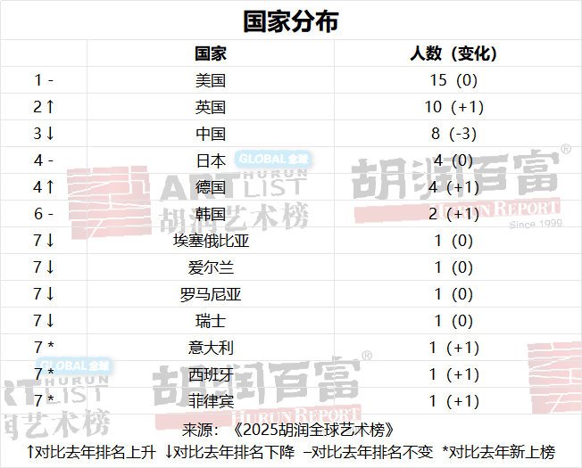 50位全球最成功的在世艺术家中,美国以15人上榜领先,英国以10人位居第二,中国以8人排名第三。这三大国家的上榜艺术家数量占榜单近七成