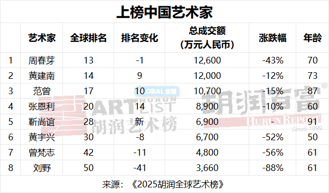 《2025胡润全球艺术榜》根据2024年度公开拍卖市场作品总成交额为全球在世艺术家排名。上榜艺术家截至2025年1月1日均为在世艺术家。榜单上非中国艺术家的数据来源于Artprice.com,中国艺术家的数据来源于胡润研究院对重庆文化艺术品行业协会、Artprice、Artron在内的多家艺术市场信息公司数据的汇总。