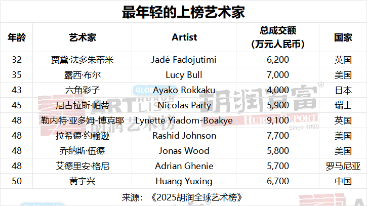 9位上榜艺术家年龄在50岁以下(含50岁)。最年轻的是32岁的英国艺术家贾黛·法多朱蒂米(Jadé Fadojutimi),她是六年来年龄最小的上榜艺术家。其次是35岁的美国艺术家露西·布尔(Lucy Bull)和43岁的日本艺术家六角彩子(Ayako Rokkaku)。这三位最年轻的上榜艺术家均为女性。50岁的中国油画家黄宇兴连续四年上榜。