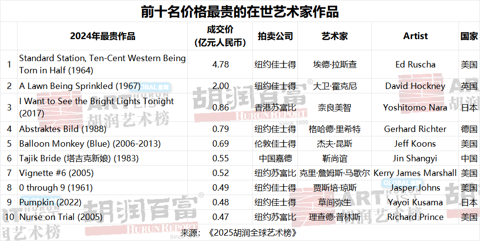在2024年的公开拍卖中,埃德·拉斯查(Ed Ruscha)1964年创作的《Standard Station, Ten-Cent Western Being Torn in Half》在纽约佳士得以近4.8亿元人民币的价格拍出,成为2024年拍出的最昂贵的在世艺术家作品。2024年最昂贵的十件作品中有1件出自中国艺术家,靳尚谊的作品《塔吉克新娘》由嘉德拍卖以5500多万元人民币的价格拍出。