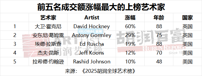 (2025年12月23日,上海)提供有质量的榜单与调研的胡润研究院今日发布《2025胡润全球艺术榜》(Hurun Global Art List 2025),榜单内容为前50名全球在世艺术家按照2024年度公开拍卖市场作品总成交额的排名。这是胡润研究院连续第六年发布“全球艺术榜”。榜单上非中国艺术家的数据来源于Artprice.com,中国艺术家的数据来源于胡润研究院对重庆文化艺术品行业协会、Artprice、Artron在内的多家艺术市场信息公司数据的汇总。