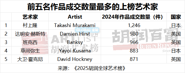 前50名全球在世艺术家中,日本艺术家村上隆(Takashi Murakami)2024年作品成交数量最多,达1246件。