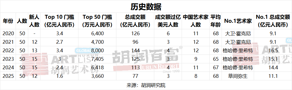 胡润全球艺术榜这六年来,平均每年有14位新人上榜。第50名的门槛降至3700万元人民币,上榜艺术家总成交额从126亿元人民币下降至77亿元人民币,第一名总成交额从9.1亿元人民币上升至11.1亿元人民币。中国艺术家上榜人数为六年来最低,仅8位。