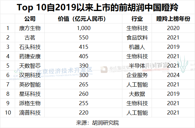 Top 10自2019以来上市的前胡润中国瞪羚