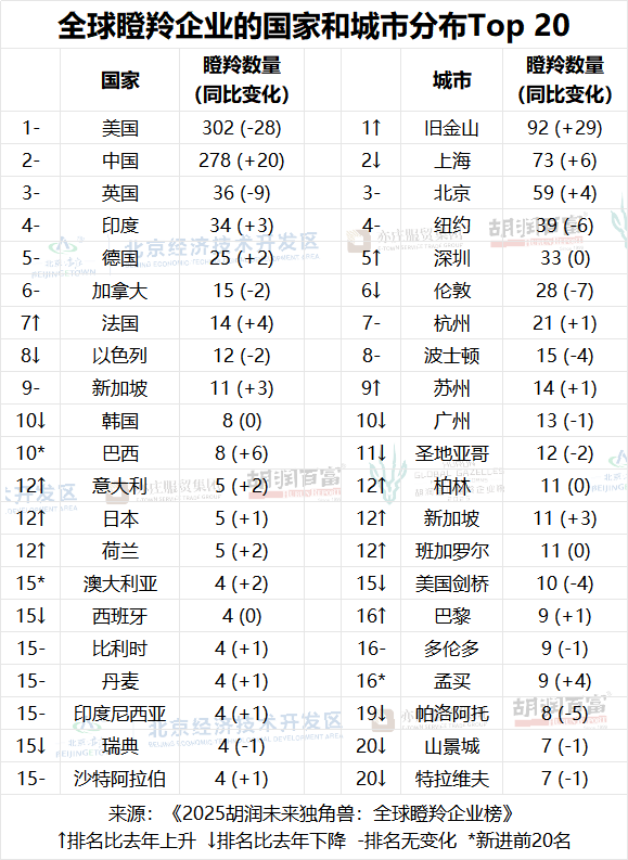 榜单所列国家和城市是指胡润瞪羚企业的总部所在地。