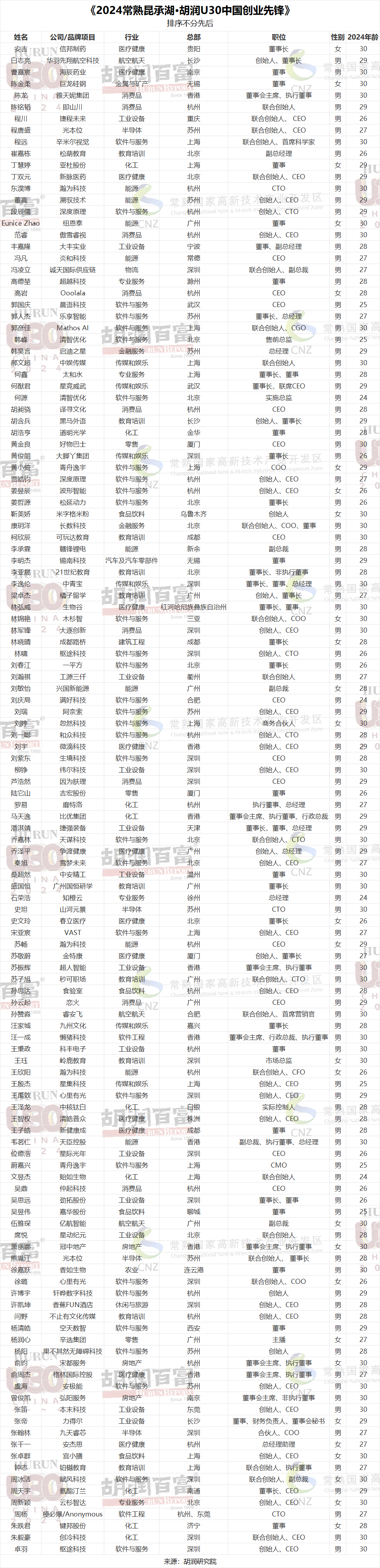 胡润研究院携手常熟昆承湖,今日联合发布《2024常熟昆承湖·胡润U30中国创业先锋》(Changshu Kuncheng Lake · Hurun China Under30s 2024),旨在寻找中国30岁及以下的创业先锋。这是胡润研究院第八次发布该榜单。